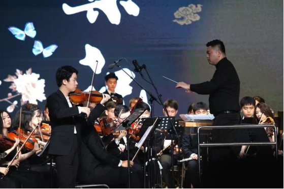 彩蝶翩翩飞,情人絮絮语,长笛宛若百灵般轻盈的歌唱中小提琴缓缓加入,奏出梁山伯与祝英台的一片深情。小提琴协奏曲《梁山伯与祝英台》由弘毅学堂2020级本科生聂一鸣独奏,长笛solo和大提琴solo分别由数学与统计学院2018级本科生骆彦华和法学院2018级本科生林济东担任,管弦交织,如丝如缕的琴声中,一段凄美的爱情故事在人文馆中娓娓道来。